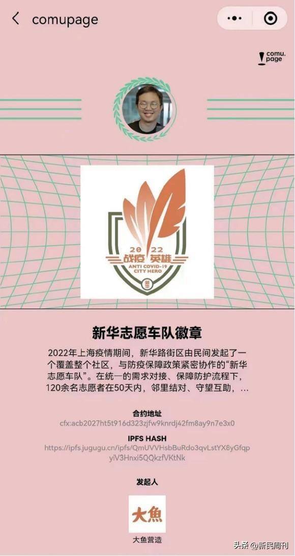 “comupage微信小程序”是一个基于Conflux树图链的专门供DAO实现组织和活动的工具沙巴体育官网★✿★,在这里★✿★,如今已经有很多DAO入驻★✿★。作为comupage的发起人★✿★,社会学学者孙哲向记者展示了一个名为“新华志愿车队徽章”的认证证明★✿★。